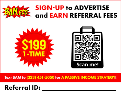 EARN SALES COMMISSION by being an ENTREPRENEUR: $99.50 per Ad will be PAID to YOU when a BUSINESS OWNER ADVERTISES with BAM.eco for $199 1-TIME by handing out the flyer below or forwarding a text: